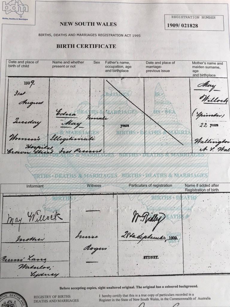 I went back to the birth register and there, waiting patiently to be found, was Edna May Willock, not Willcock, born 1909 at Crown Street hospital in Sydney, mother May Willock, and a big line through the space where the father’s name should be written. The word ‘illegitimate’ leaped off the paper and sliced into my core like a rude profanity.