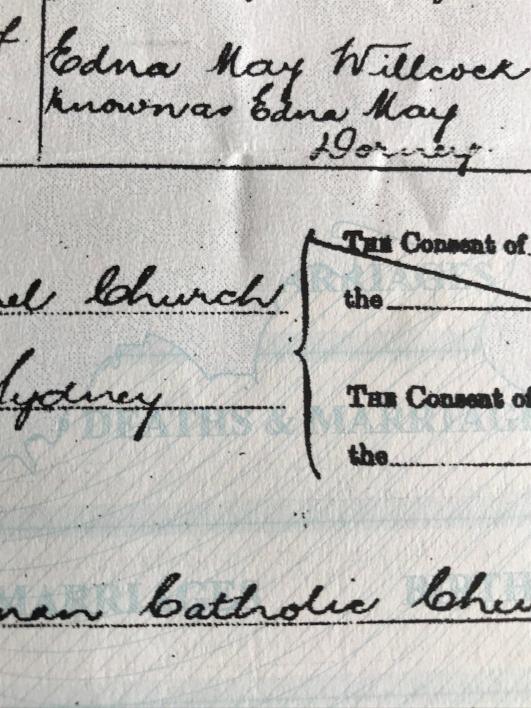 In the marriage record, I found a clue to Edna’s birth. Curiously, her name was recorded as Edna May Willcock, ‘known as’ Edna May Dorney. Edna’s mother was recorded as May Willcock, deceased, and the space where a father’s name should be written, was empty.