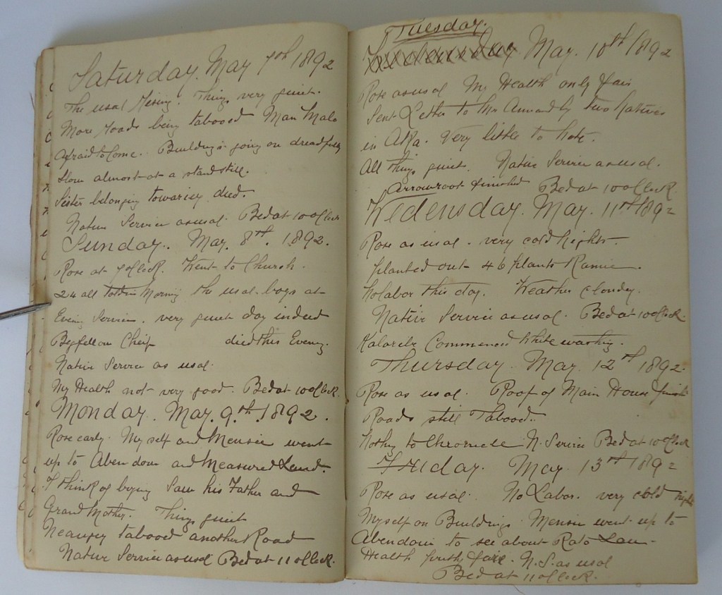 While he was in the New Hebrides, Francis kept a small diary. It was just big enough to hold his words, and just small enough to fit in his pocket. At that particular time in New Hebridean history there was a lot of conflict between the native tribes and from time to time he wrote about it: