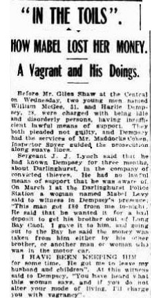 Harlie (or Harley) Dempsey was born in Bathurst and Mabel might have known him from her days growing up in the area. Harlie came from a family of boys who were small time criminals. He had served in WWI, been injured and didn’t seem to be able to hold down a job. His brothers Jack (not the boxer!) and Ron were committing crimes of the sort that earned an occasional stint in prison.