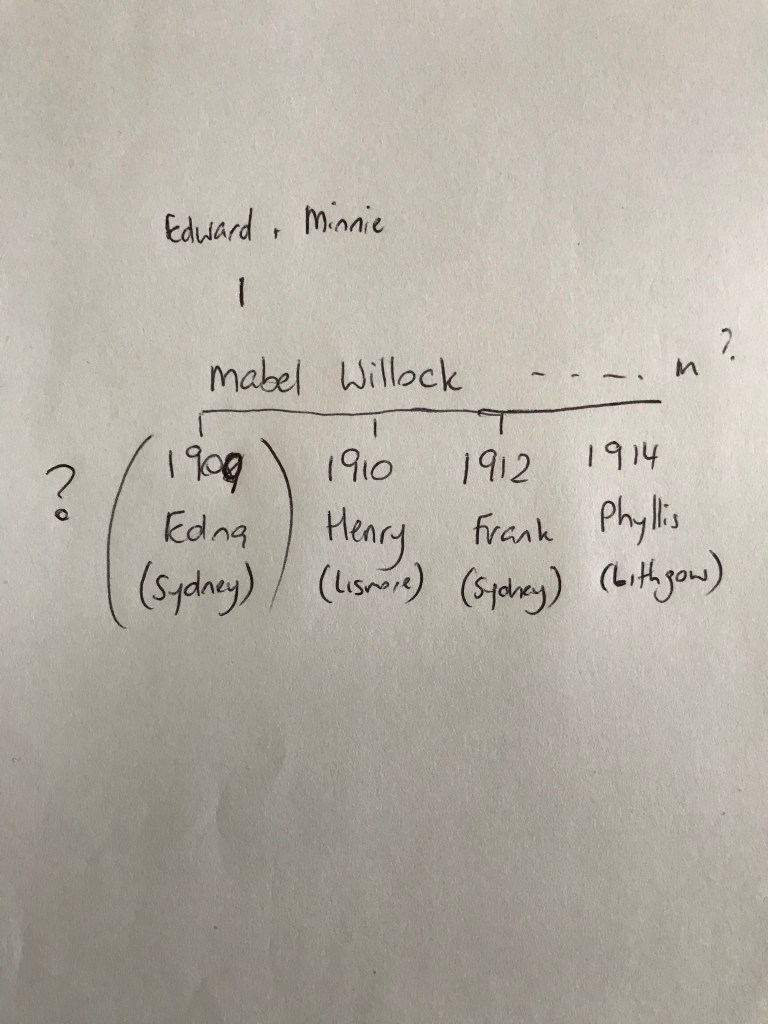 In 1910 in Lismore in northern New South Wales, Mabel gave birth to a baby boy named Henry Charles Willock. Henry’s father was not named in the record. By about this time Mabel’s parents and siblings were living at Mallanganee, about 70kms from Lismore.