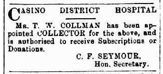 Tom Collman senior died in Casino in 1929, incidentally (or coincidentally) at the very hospital where his involvement in the local community began.