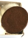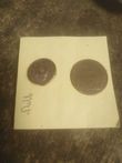 A two hole brass button – most likely a common workman’s button, could have been worn by farmer. There is a lovely circle of blue around the centre. This blue colour is oxidisation of the brass, not man made.