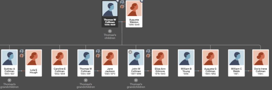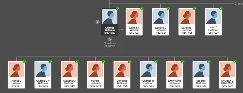 In 1880, Charles Collman’s brother Thomas Collman married Louisa Weston’s sister Augusta Weston in Cooma NSW. Thomas and Augusta had three sons who could be MG –