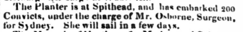 From London, the same day, whence she sailed the 16th of June, the ship Planter, Captain Frazer, with 200 male prisoners. Passengers, Lieutenants Bullin and Irvine, of the 38th Regiment; Alexander Osborne, Esq., R. N., Surgeon Superintendent; Mr. Busby; 28 rank and file of the 4th Regiment; 1 sergeant of the 39th; 3 women and 1 child.